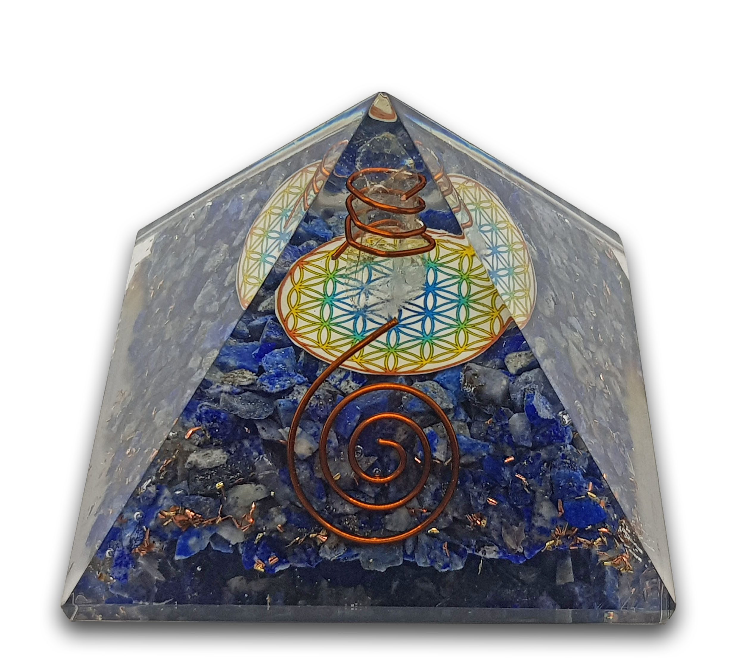 Πυραμίδα οργονίτης με λάπι λάζουλι, αιχμή χαλαζία, σπείρα από χαλκό και το λουλούδι της ζωής, μεγάλο μέγεθος Βάρος:203 γρ. Διαστάσεις:7.4×7.4×7